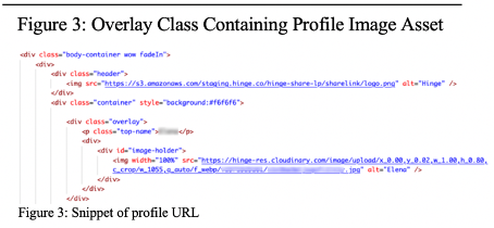 As seen in Figure 3, profile pictures are loaded into the browser-based profile page through the hinge-res subdomain of Cloudinary. The URL extension, including the various tags denoted with backspaces, are a part of the Cloudinary Image Transformation API.
