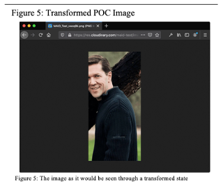 To demonstrate accessing original user assets, and to protect the information and identify of Hinge users, a limited proof of concept has been created using a free account on the Cloudinary platform. After creating a free account, a public domain image was uploaded to the account’s media library. Next, using the Transformations dashboard, a new transformation was created which adjusts image width to 461 pixels, moves the x axis to position 190 and the y axis to position 0. The final transformation request looks like the following “c_crop,w_461,x_190,y_0”. With Strict Transformations not enabled, the transformation was applied to the sample image . The new transformed image was browsed at the footnoted address and is shown in Figure 5.7.