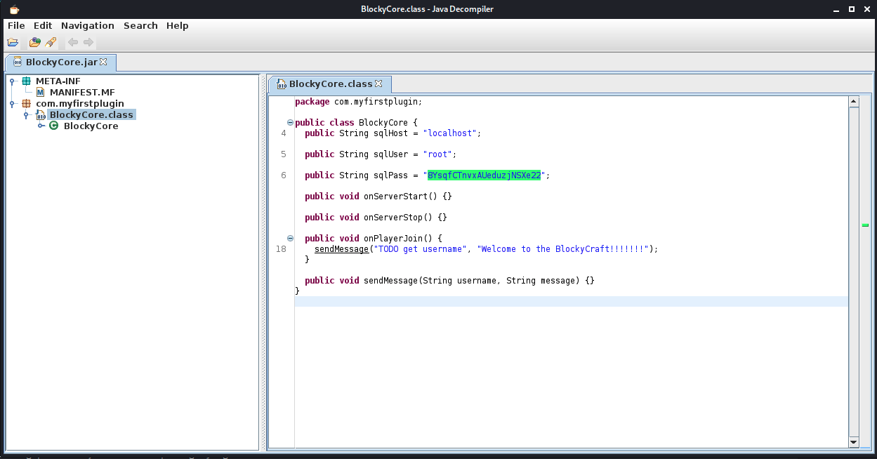 The resulting output indicated the /plugins directory, which when browsed, showed a custom plugin called BlockCore.jar. I downloaded the file and used the java decompiler tool jd-gui to inspect the classes. The class blockycore uses a hard-coded username and password, root:8YsqfCTnvxAUeduzjNSXe22.